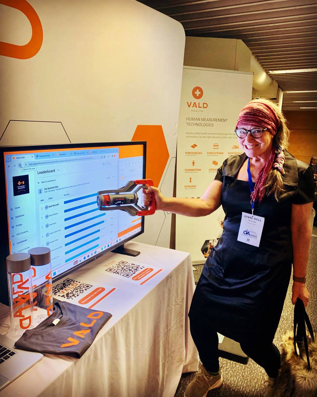 Dell testing her strength at an Osteopathy conference